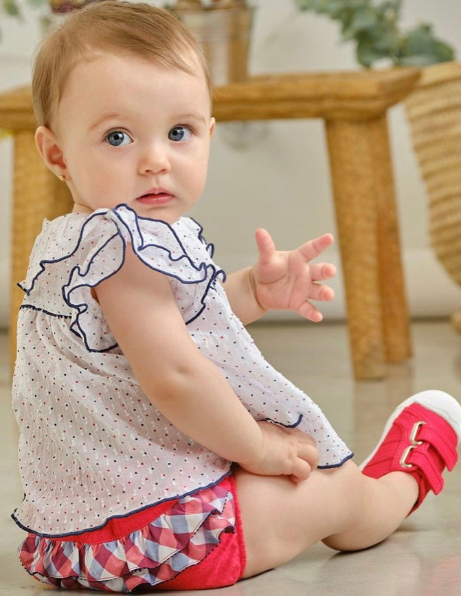 RED & NAVY POLKA DOTS WHITE BLOUSE WITH CHEQUERED BLOOMER SET.