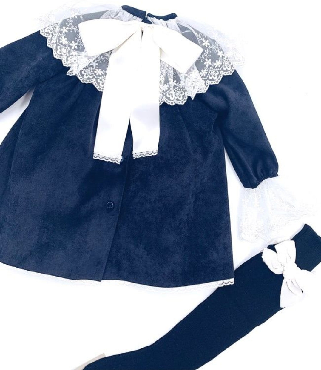 BABY WINTER DRESS WITH WHITE EMBROIDED LACE COLLAR & RIBBON AT THE SIDE EDGE OF DRESS & BIG WHITE RIBBON AT BACK.