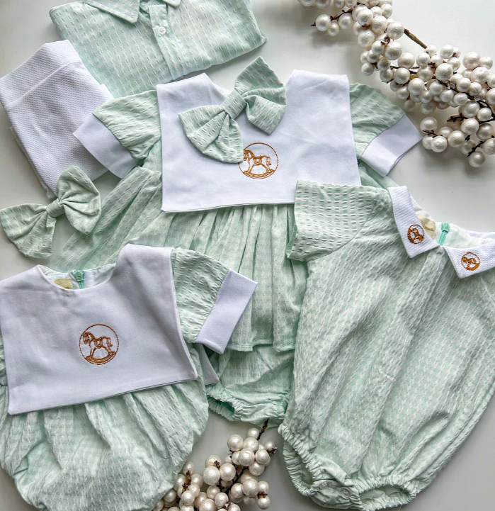 طقم من فستان أطفال بأكمام قصيرة مع لون أبيض كبير ومزود بمشبك للشعر و سروال. يُفضل اخذ مقاس اكبر لطفلك لان المقاسات الاسبانية صغيرة SET OF SHORT SLEEVES BABY DRESS WITH BIG WHITE COLLAR & WITH PANTY & HAIR CLIP.