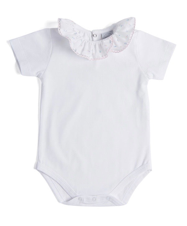BABY BODYSUITS HAVE SHORT SLEEVES PURE WHITE, FLOWER,OR PINK WITH LACE COLLAR