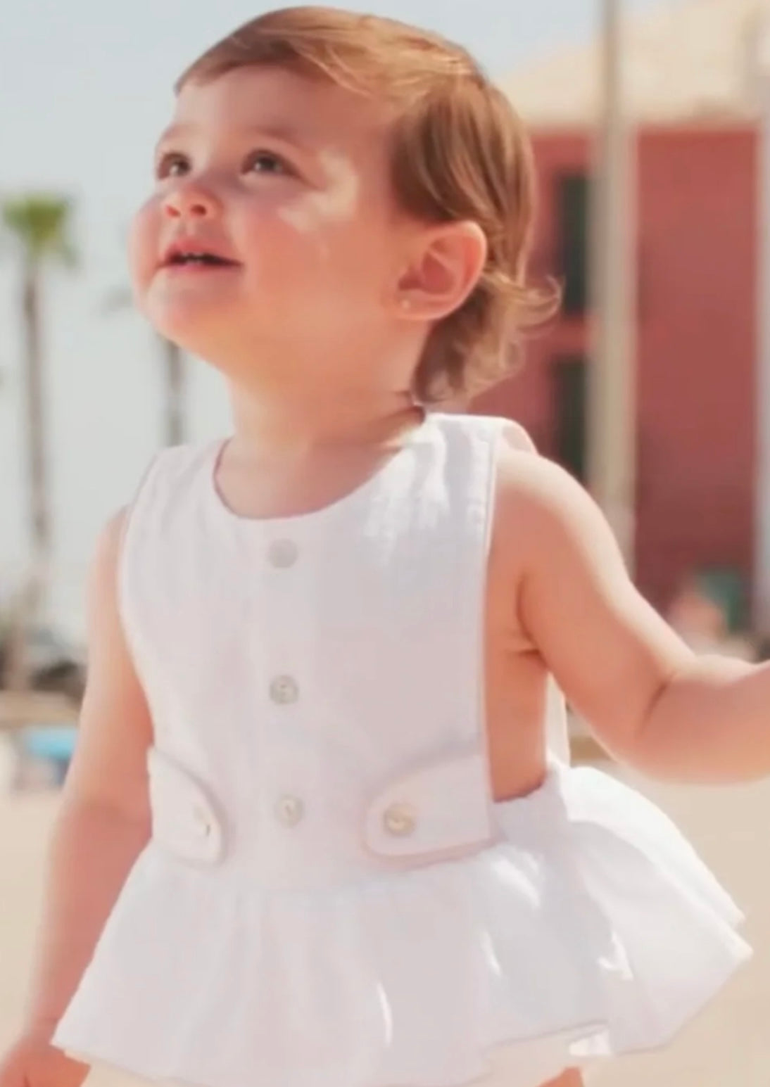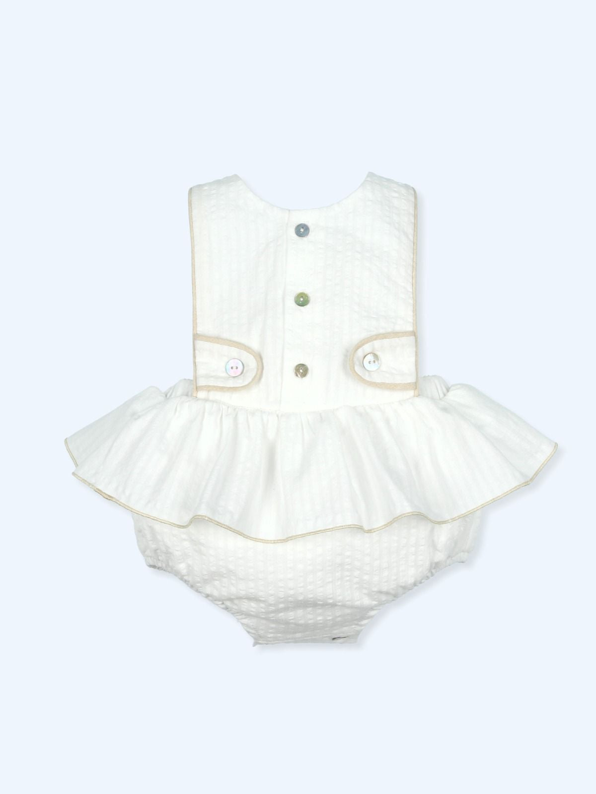 A BABY TEXTURE COTTON  DUNGAREES WITH A SKIRT AND A BUTTON IN THE FRONT.