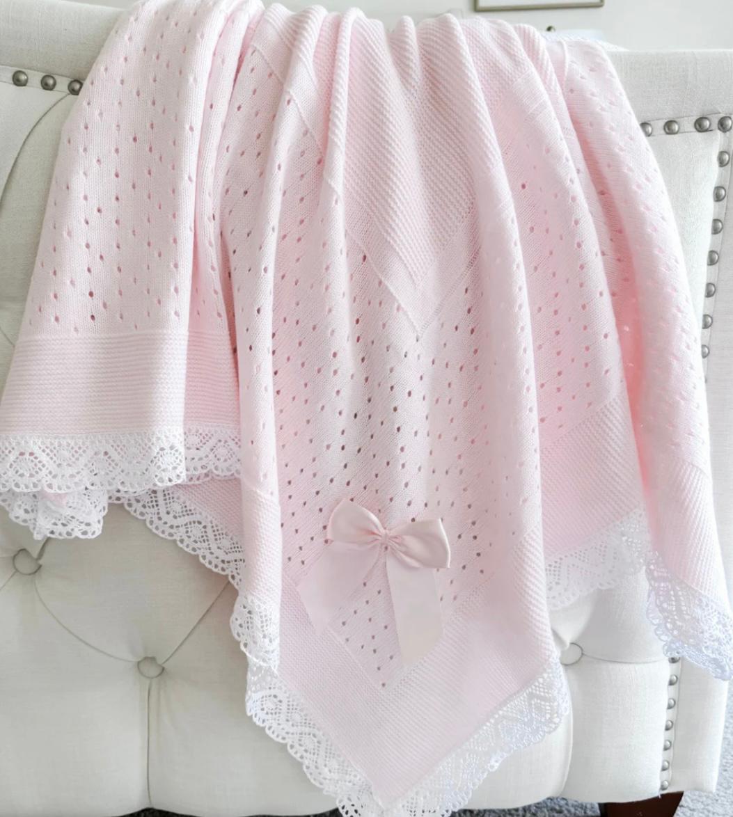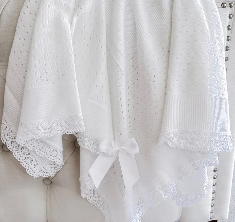 SPANISH LACE BLANKET, A STYLE OF TRADITIONAL BABY SHAWL. IT FEATURES A DELICATED KNIT PATTERN, A WHITE LACE TRIM, and a large silk bow.