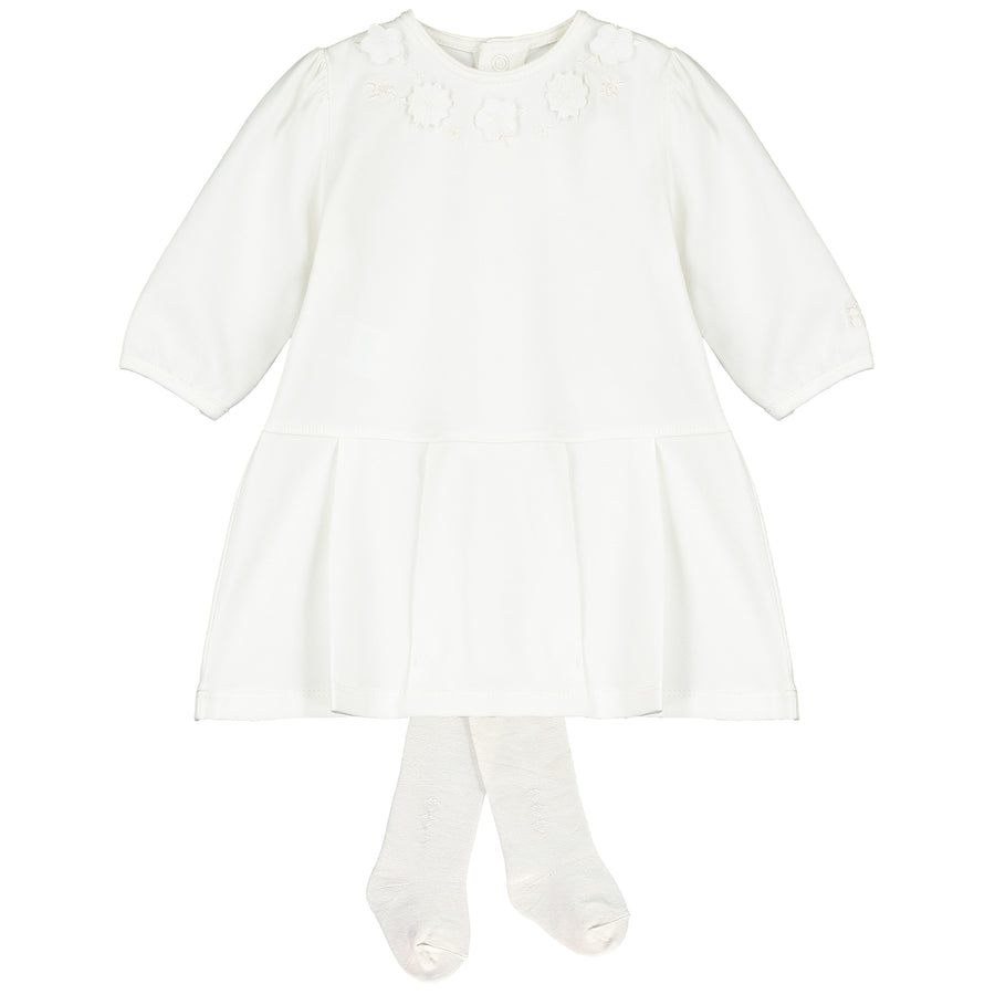 Celeste is a simple but beautiful ivory dress. Embroidered 3D flowers encircling the neck drop waisted pleated skirt and matching ivory tights makes this dress perfect for any special occasion.