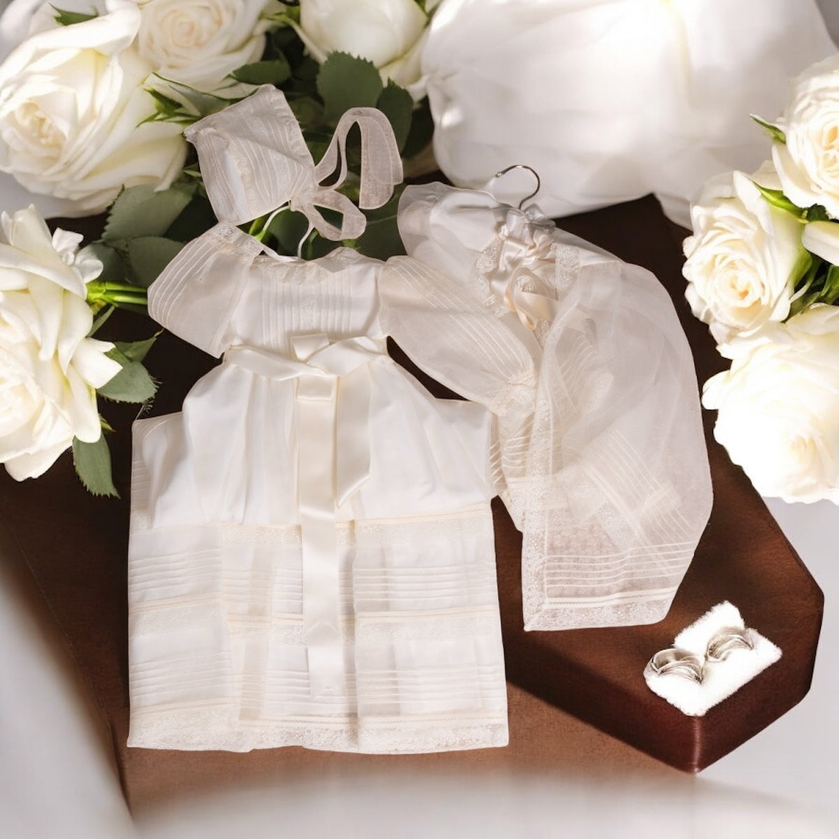 فستان سيترو للأطفال بأكمام طويلة وتصميم مطرز في الأمام مع دانتيل ساتان على الشريط وقبعة و كيب.