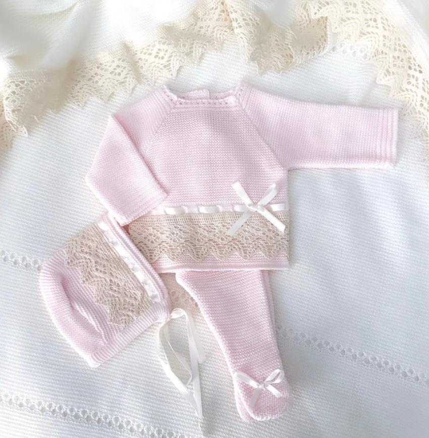 BABY SET OF KNITTED LONG SLEEVES BLOUSE WITH OFF WHITE LINING LACE & RIBBON WITH EMBROIDED DESIGNS AT EDGE & PANTS WITH CAP. Note: Spanish products wear for small sizes. Advice: Take bigger size for your little one. |