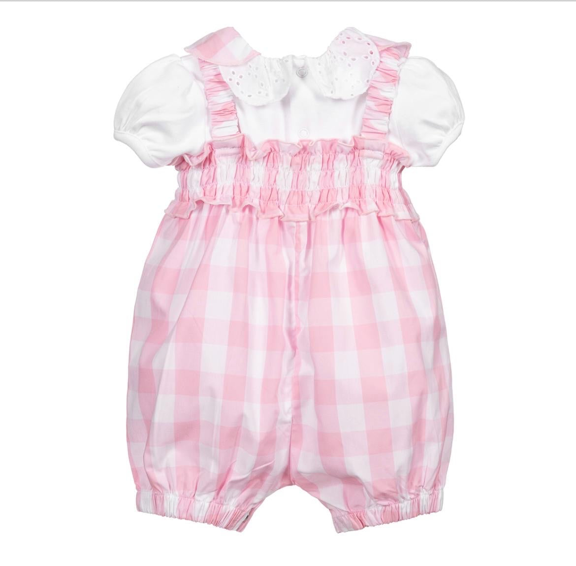 BABY SET OF SHORT SLEEVES WHITE BLOUSE WITH CHEQUERED ROMPER SUIT WITH RIBBON INFRONT