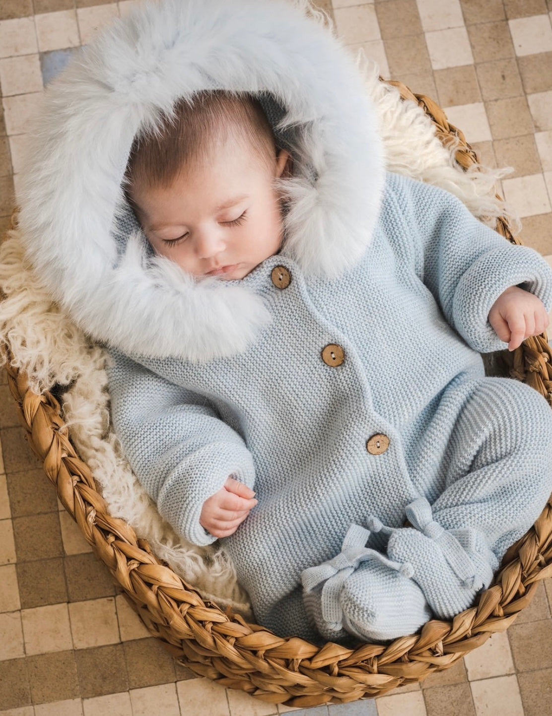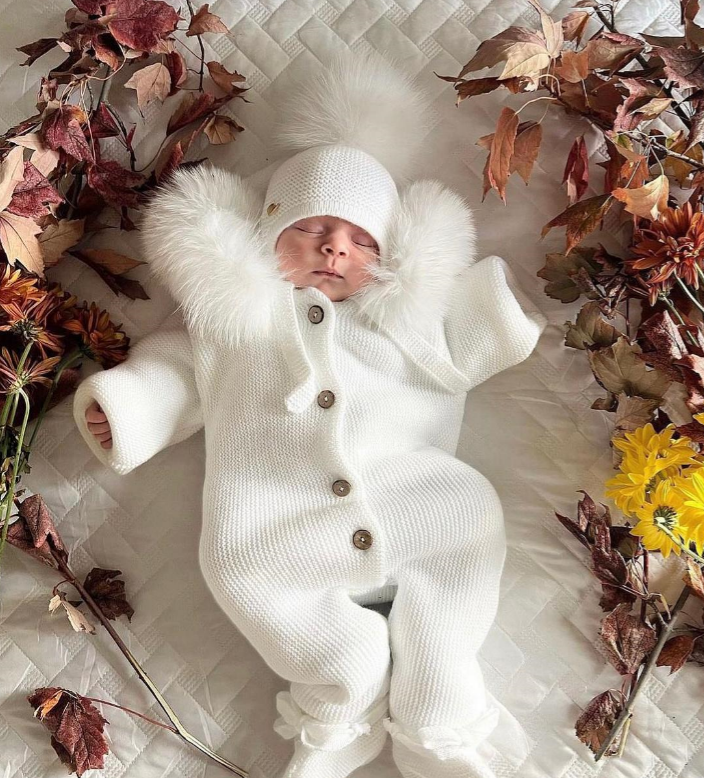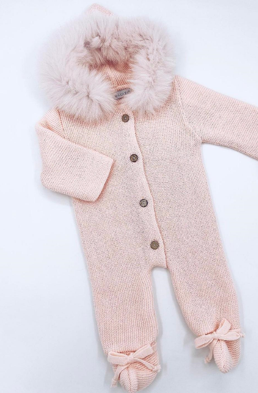 BABY WINTER KNITTED OVERALL WITH FAUX FUR LINING IN HOOD.