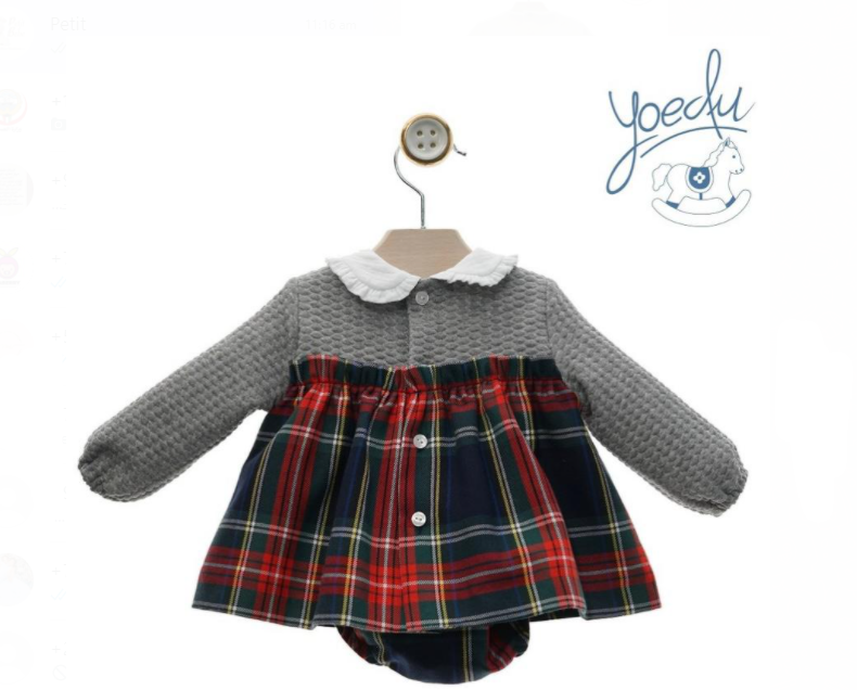 LONG SLEEVES WINTER DRESS WITH WHITE COLLAR WITH HALF GRAY & HALF CHEQUERED STYLE WITH PANTY & HAT. Note: Spanish products wear for small sizes. Advice: Take bigger size for your little one. |