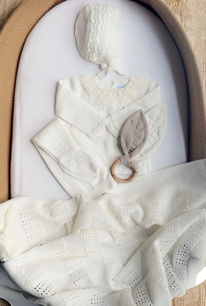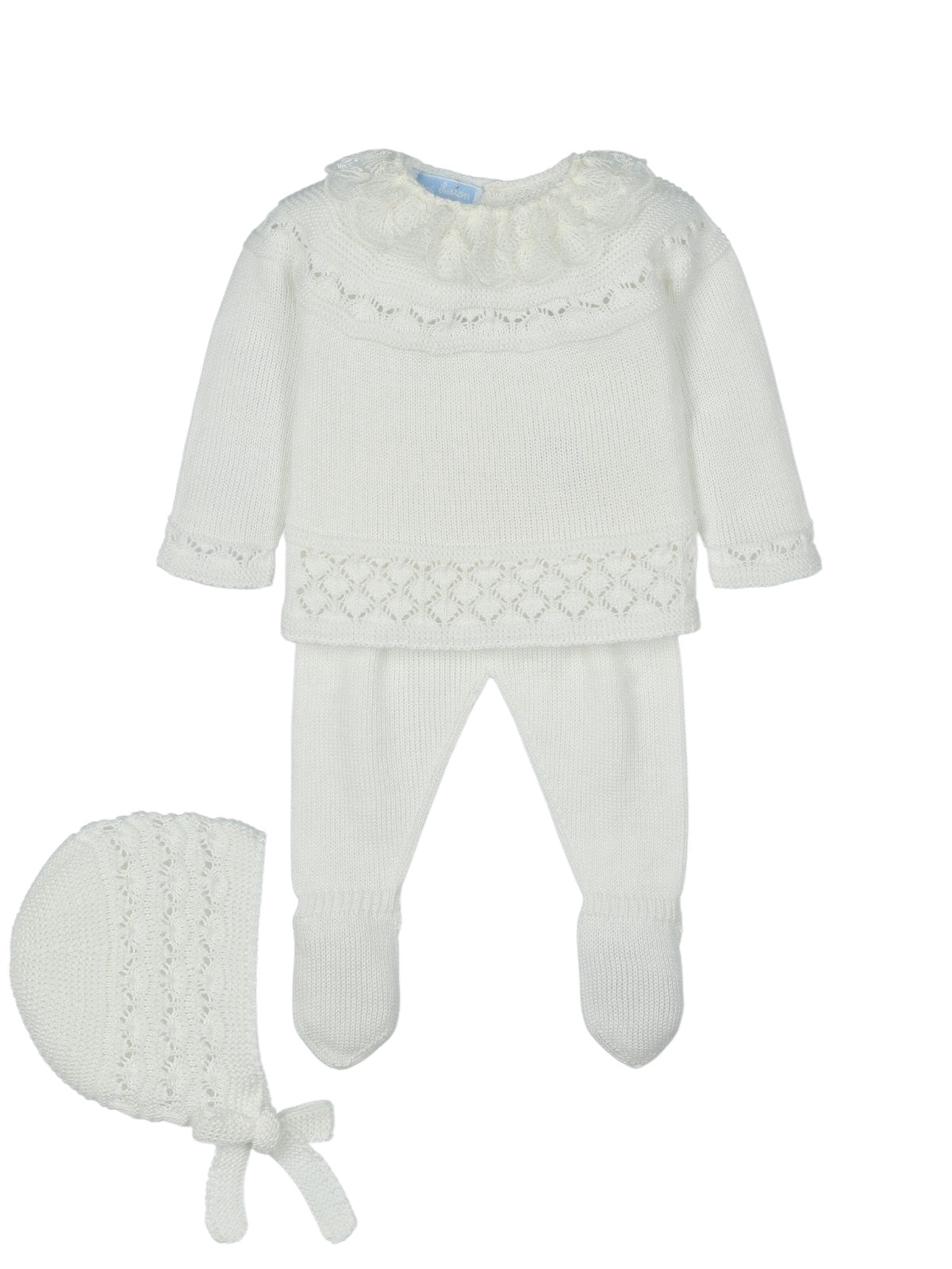 THREE-PIECE OUTFIT INCLUDES KNITTED SWEATER WITH EMBRODERY TULLE COLLAR ,LEGGINGES AND HAT.