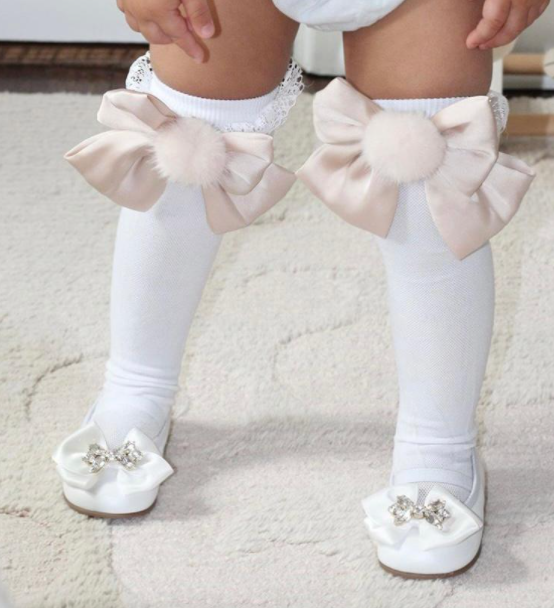 LONG PLAIN WHITE SOCKS WITH CLIP BIG SATIN  RIBBON WITH POMPOMS IN DIFFERENT COLORS.