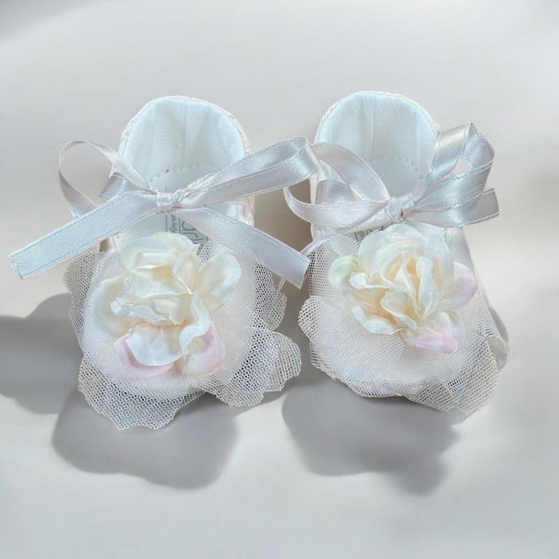 DESIGN AND MADE BY ITALY ITS KIND OF CRADLE SHOES THAT MAKES YOUR BABY COMFY FROM ALL WALKS THE DESIGN IS VERY FASHIONABLE WITH LACES AND FLOWER AND RIBBON