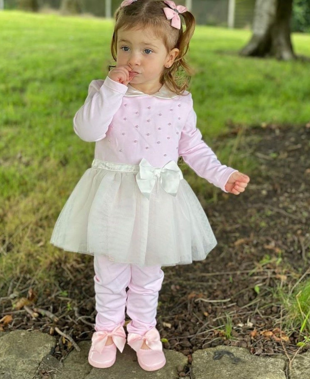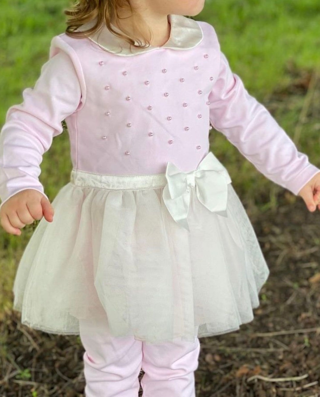 BABY LONG SLEEVES OVERALL WITH WHITE COLLAR & PEARLS DESIGNS WITH WHITE LACE & WHITE RIBBON ON WAIST .